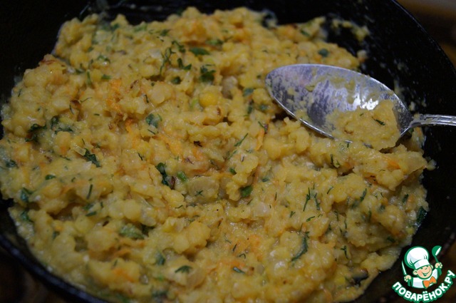 Лук с морковью добавить к гороху, посолить и поперчить по вкусу. Добавить измельченную зелень.