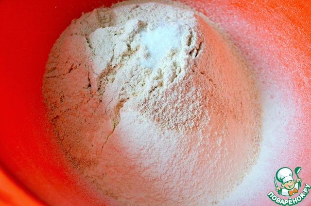 В сухую миску просеять оба вида муки,