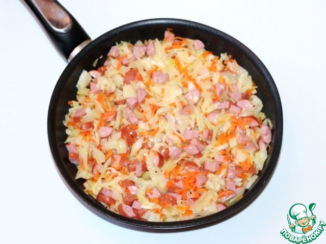 8. Через 5 минут добавляем мелко порезанные сосиски, по вкусу соль и молотый перец. Можно добавить 2 ст. л. воды. Тушим под крышкой до готовности овощей и испарения жидкости.