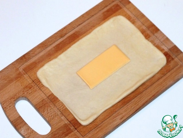 11. Берем по одному шарику и раскатываем тесто в пласт, 20*15 см. Кладем по 1/2 пластины сыра для тостов.