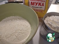 Муку просеиваю в ёмкость для замешивания. Оставляю в сите немного муки (около 2-3 ст. ложек) для подпыла стола в дальнейшем. Включаю духовку на минимум (у меня 50 градусов). |