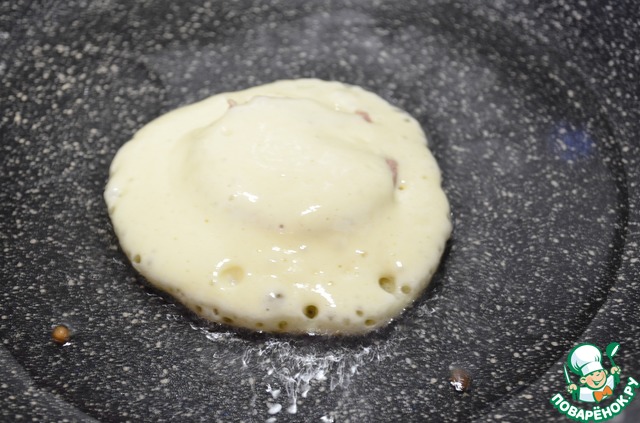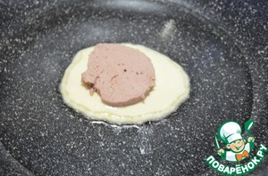 Разогреть сковороду, налить масло, ложку теста, на тесто кружок паштета.