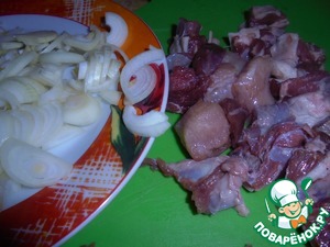 Лук очистите и нарежьте полукольцами. Баранину нарежьте на кусочки.