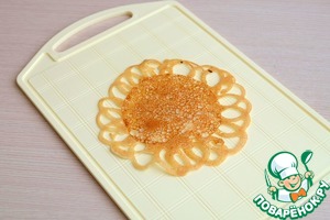 Сковороду поставить на медленный огонь, добавить небольшое количество теста на сковороду, распределить в зависимости от требуемой величины корзиночек. Далее корнетиком нанести рисунок в круговую. Выпекать блинную салфетку как обычные блины.