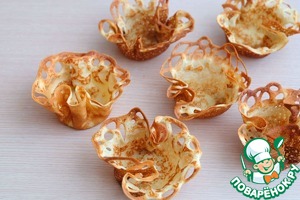 Далее блинные салфетки-заготовки поместить в форму для выпекания кексов и отправить в разогретую до t150-180С духовку. Корзиночки слегка подсушить для сохранения заданной формы.