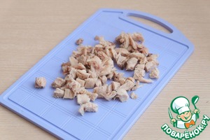 Куриные бедра отварить в подсоленной воде, нарезать кубиками.