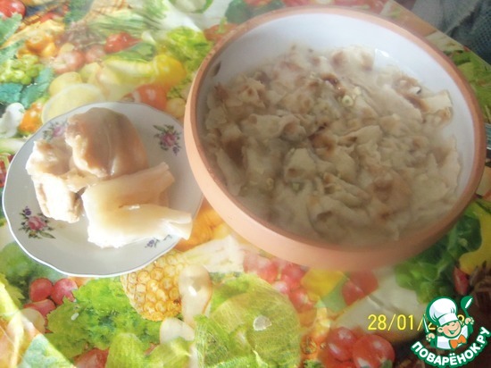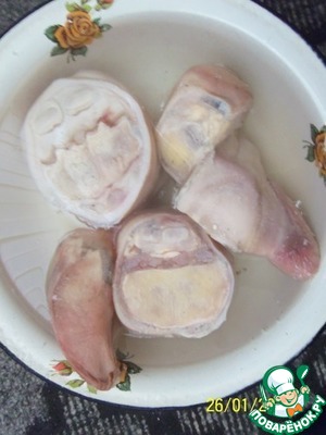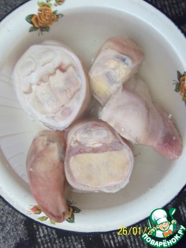 Рецепт супа требует много времени на приготовление. В первую очередь необходимо подготовить говяжьи ноги. Как следует пропалить, поскоблить, удалить верхний слой копыта. Разрубить ноги вдоль и убрать волосяные луковицы, прячущиеся под кожей. Залить холодной водой и оставить на сутки. Менять воду каждые 2-3 часа. По истечении необходимого времени, снова помыть говяжьи ноги и поместить их в объемную кастрюлю.