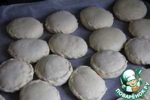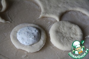 Когда тесто готово, обмять его и раскатать в пласт, толщиной около 1 см. Вырезать круглые лепешки стаканом или вырубкой. Укладывать начинку и скрепить края.