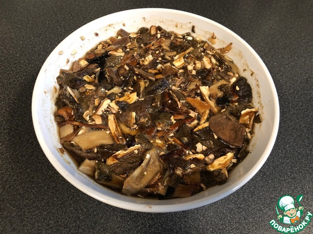 Сушеные грибы заливаем водой и даём постоять 30 минут, чтобы набухли. Затем сливаем воду на сито, промываем водой.