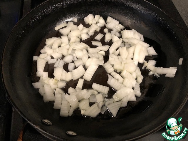 Лук мелко режем и пассируем на растительном масле до прозрачности.