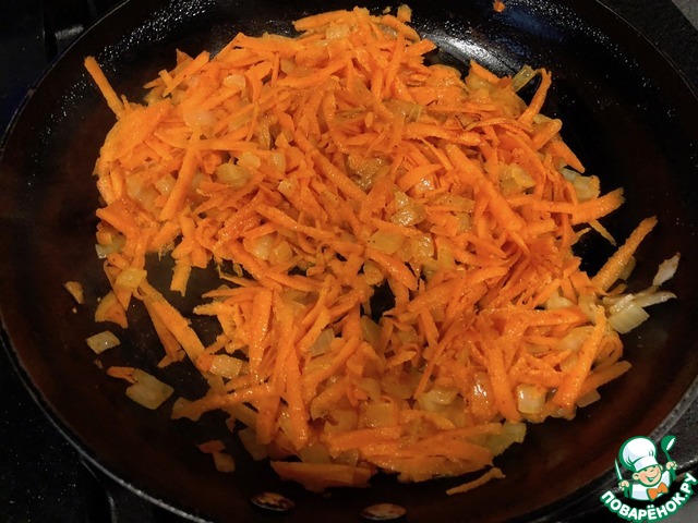 Затем добавляем натертую на терке морковь и копченую паприку. Перемешиваем и тушим 2-3 минуты. |