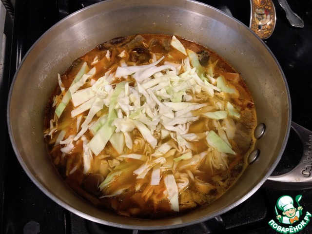 Затем добавляем мелко нарезанную капусту и варим ещё минут 5.