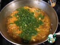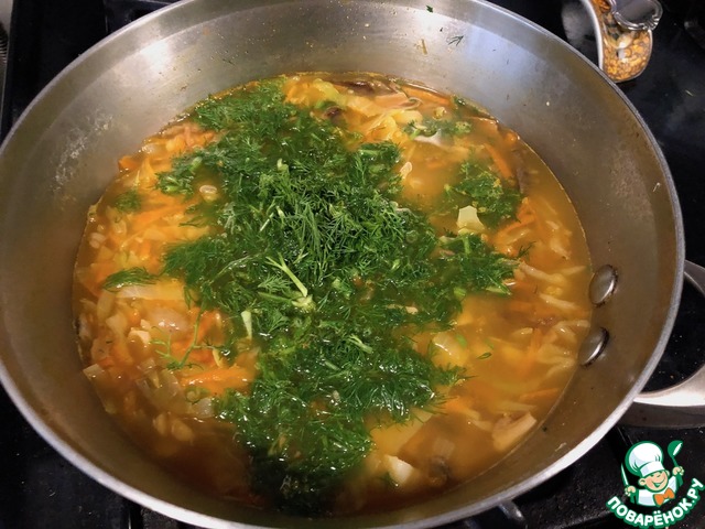 Затем кладём мелко нарезанный укроп, закрываем крышку, выключаем газ и даём настояться около 5 минут.