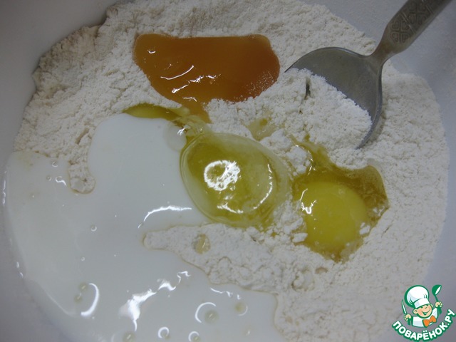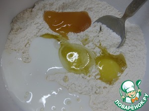 Добавить яйца, мед и кефир (кефир и муку измерять одним стаканом),