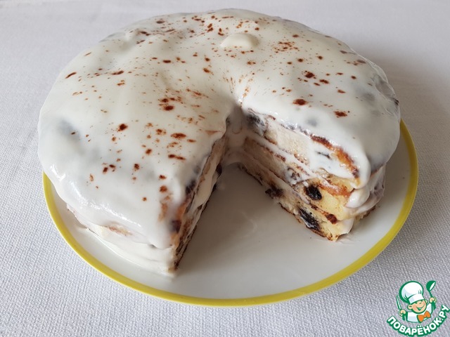 Последующие пышки складывать друг на друга стопочкой, также смазывая сметаной/йогуртом, пересыпая сахаром - получается этакий тортик.