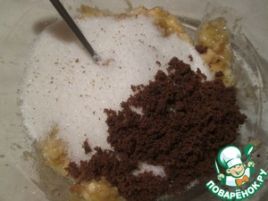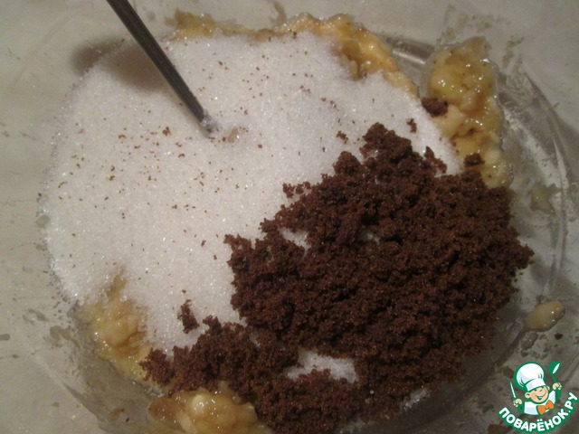 Духовку прогреть до 180 градусов. Обжарить на сухой сковороде по одной столовой лодке черного и белого кунжута, постоянно помешивая в течение пяти минут. Бананы пробить блендером в пюре, смешать с сахаром. Часть обычного сахара я заменила на коричневый ( мусковадо ), Викулин подарок. Он придал выпечке прекрасный цвет и аромат.
