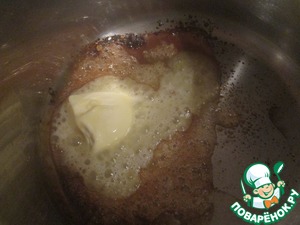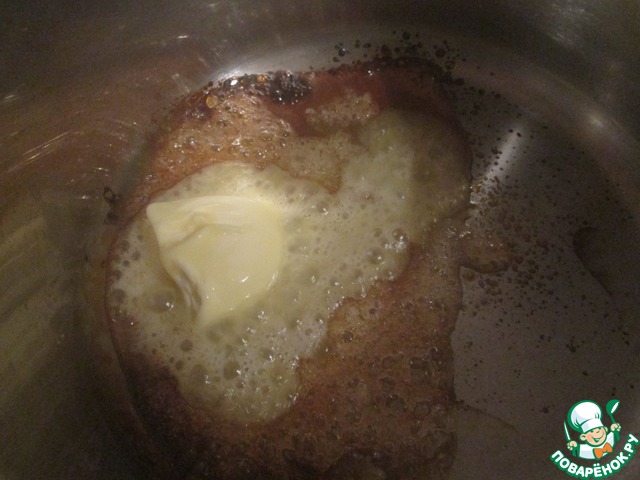 В кастрюле расплавить сахар до образования золотисто-желтой карамельной массы и добавить в нее сливочное масло. -