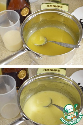 Снять с огня ковшик, добавить молоко и коньяк. Перемешать. Остудить до комнатной температуры.