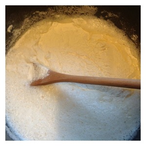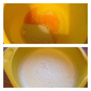 Яйца с солью и сахаром взбить миксером в пену. Продолжая взбивать влить кипяток и продолжаем взбивать. Масса увеличивается в объеме в 2 раза и пенится.