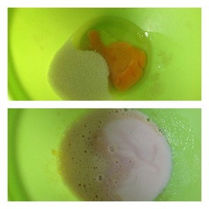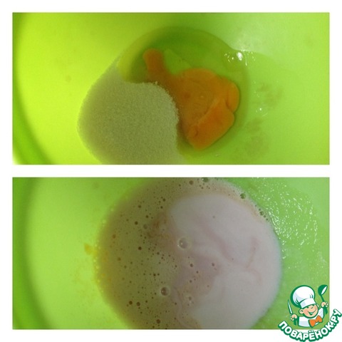 Яйцо взбить с сахаром. Йогурт слегка подогреть и добавить к яичной смеси. Перемешать.