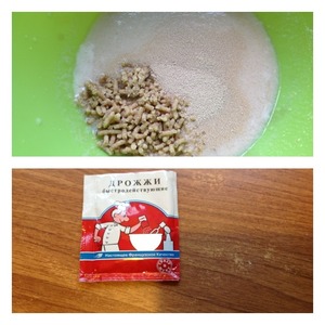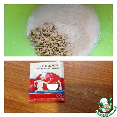 Всыпать дрожжи и орехи прокрученные через мясорубку. Перемешать.