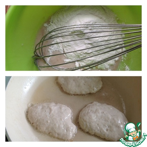 Всыпать муку и венчиком тщательно все размешать. Оставить тесто на 40 минут в теплом месте. Подошедшее тесто перемешать и выпекать оладьи на хорошо разогретой сковороде в достаточном количестве растительного масла с двух сторон при закрытой крышке.