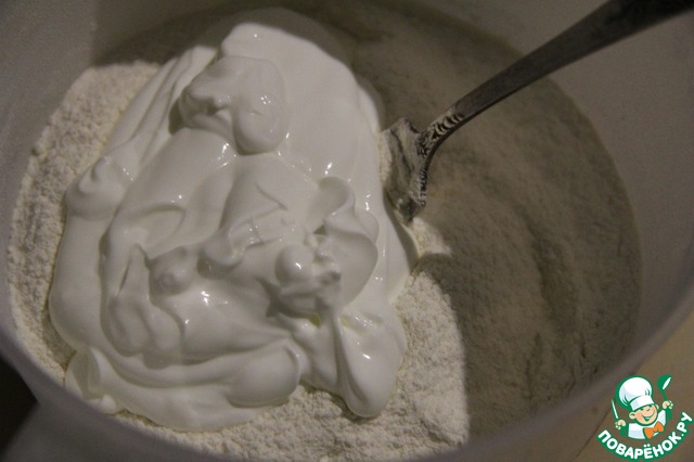 Пока опара поднимается, смешать пшеничную муку, сметану, размягченное масло и взбитый белок.
