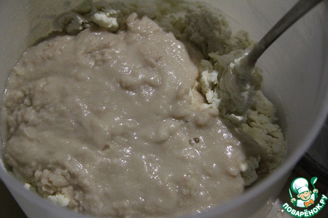 Соединить тесто с опарой. Добавить желток, молоко, с растворенными в нем солью и сахаром.