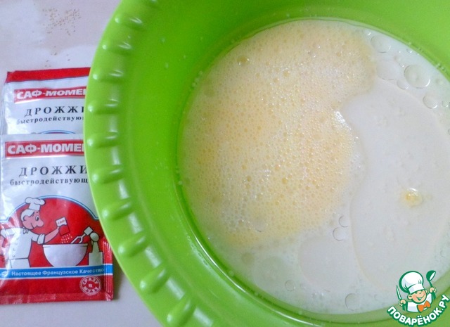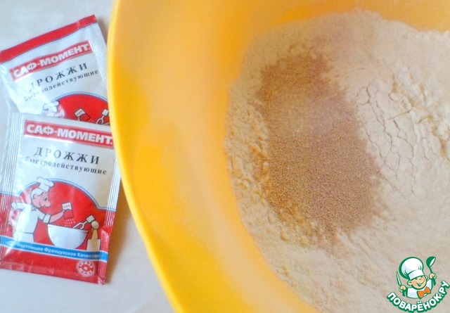 Смешать просеянную муку с сухими быстродействующими дрожжами ТМ САФ-МОМЕНТ, сахаром, солью.
