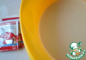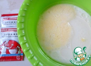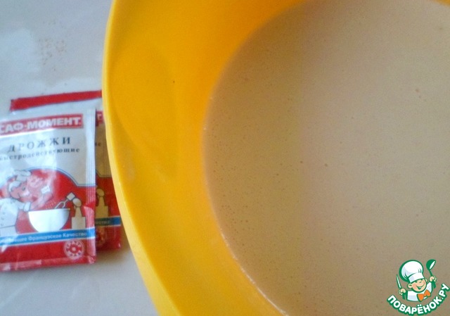 Вливать жидкую смесь в сухую и размешивать венчиком. Сначала вылить половину жидкости, хорошо вымешать чтоб не было комочков. Затем влить остальное молоко и хорошо перемешать. Накрыть миску пленкой и поставить для подхода в теплое место на 30 -40 минут.