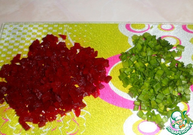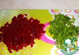 Заранее отваренную свеклу нарезать мелкими кубиками, добавить чуточку масла и перемешать., чтоб она не окрашивала блины. Зеленый лук нарезать мелко.