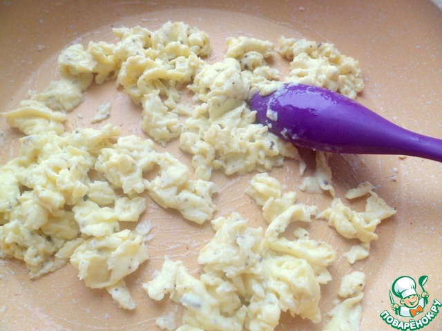 Растопить на сковороде, на маленьком огне, сливочное масло и сразу вылить яичную смесь. Часто мешаем, чтоб получилась яичная кашка, дать остыть.
