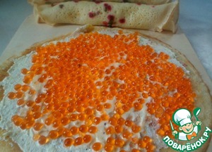 Смазать блин творожно -яичной смесью, сверху разложить икру, свернуть рулетом, обрезать не ровные края. А сам рулетик разрезать пополам по косой.