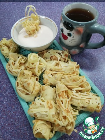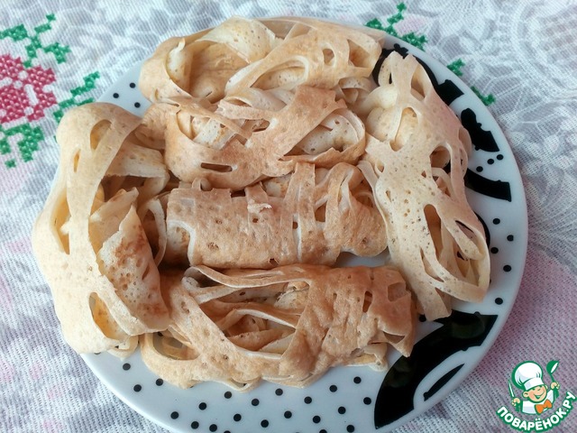 Необычные ажурные блинчики, которые можно подавать к праздничному столу вместо хлеба и удивить своих гостей. Красивые, оригинальные и очень вкусные. Едят, окуная в любой соус. Блины при жарке получаются хрустящие, но через минуту размягчаются и легко складываются.