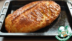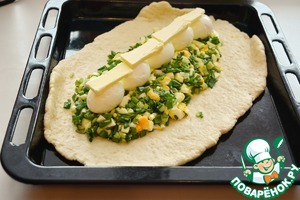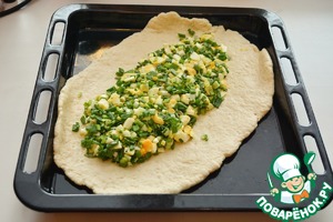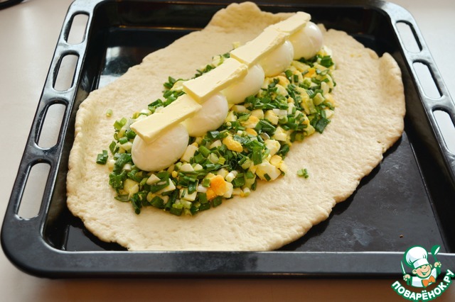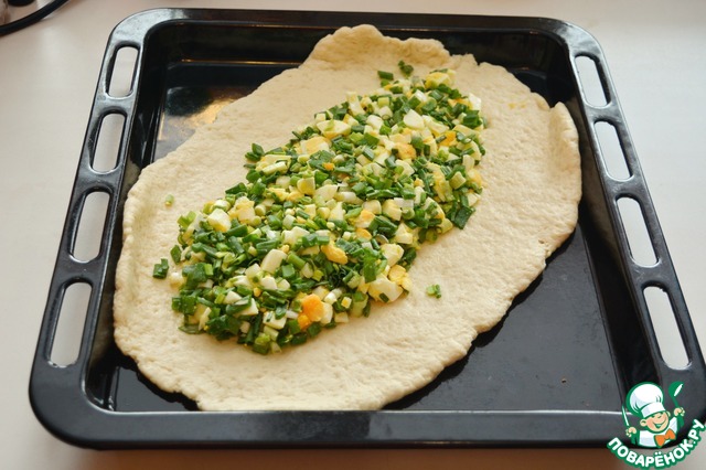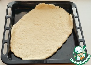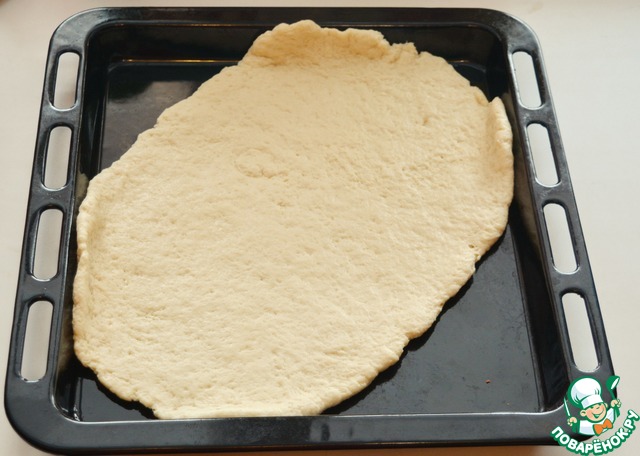 Тесто раскатайте в овальный пласт и поместите на смазанный маслом противень