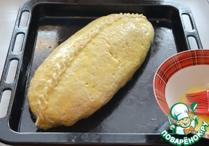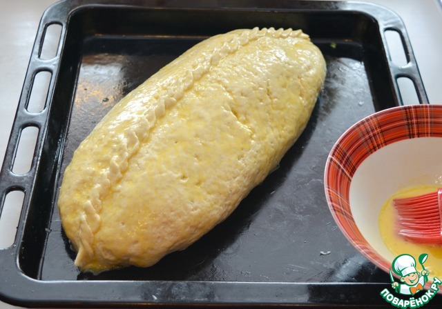 Защипите края кулебяки как у пирожка. Смажьте яйцом и дайте постоять около 15 минут