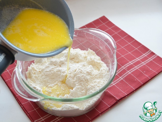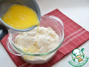 Влейте молоко с маслом к муке и начните замешивать тесто