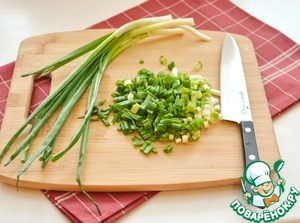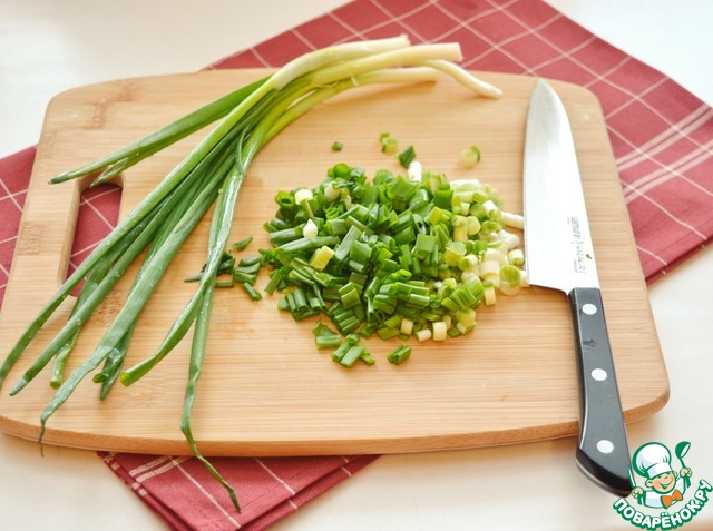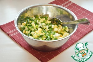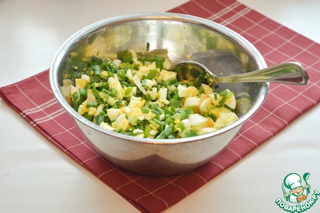 Смешайте яйца с луком, слегка подсолите и перемешайте