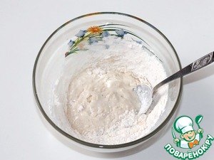 2. Смешиваем 2 ст. л. муки с сахаром (1 ст. л.) и дрожжами. Добавляем 50 мл теплого молока, перемешиваем венчиком. Ставим миску с опарой в теплое место. Через 10 минут опару перемешиваем, чтобы не было комочков.