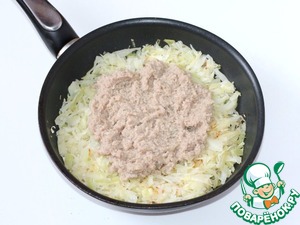 10. Капусту смешиваем с мясным фаршем, солим, перчим, перемешиваем и снимаем сковороду с плиты.