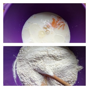 Яйцо взбить с щепоткой соли и растительным маслом. Добавит молоко, перемешать и всыпать муку.