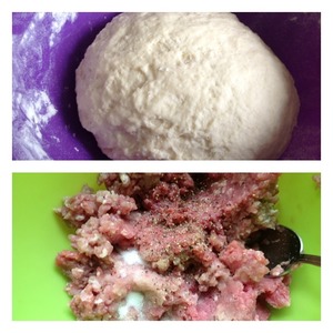 Вымесить эластичное, не липнущее к рукам тесто. Оставить тесто пока в сторонку, накрыв его полотенцем. Тем временем перекручиваем мясо вместе с луком и чесноком на мясорубке. Добавляем соль и смесь перцев.