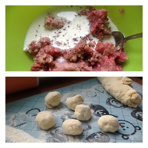В фарш вливаем молоко и тщательно вымешиваем фарш. Рабочую поверхность припыляем мукой и "раскидываем" тесто на достаточно большие клубочки.