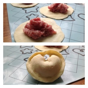 Каждый клубочек теста раскатываем достаточно тонко, в диаметре около 15 см. В центр каждого круга выкладываем фарш и формируем пельмень.