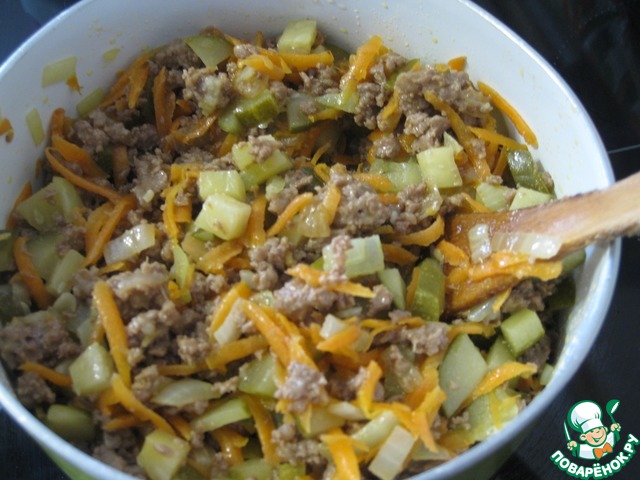 У меня фарш был уже обжаренный, - если у вас сырой, то вы просто смешайте его с овощной составляющей начинки. -
