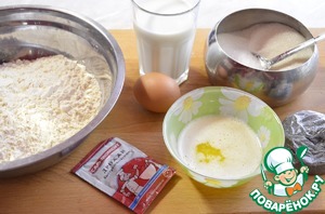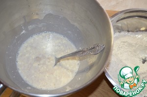 Делаем опару. Наливаем теплое молоко, в него добавляем сахар, щепотку соли. Дрожжи и три столовых ложки муки из общей указанном массы муки.