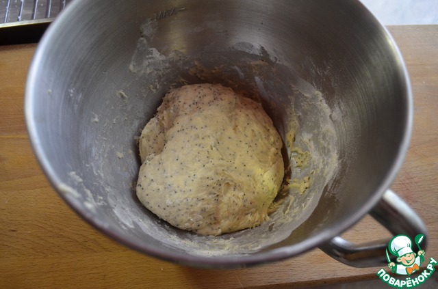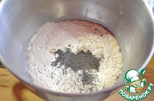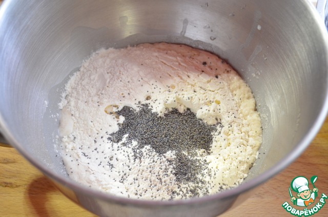 Следующим этапом добавляем растопленное сливочное масло, яйцо, оставшуюся муку и мак. Мак я добавляю прям сухой, если вас этот момент смущает залейте его предварительно кипятком, остудите.