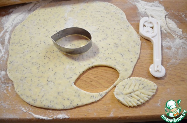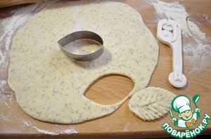 Из меньшей части раскатываем тонко тесто и вырезаем листочки. Я воспользовалась вырубкой -лепесток.