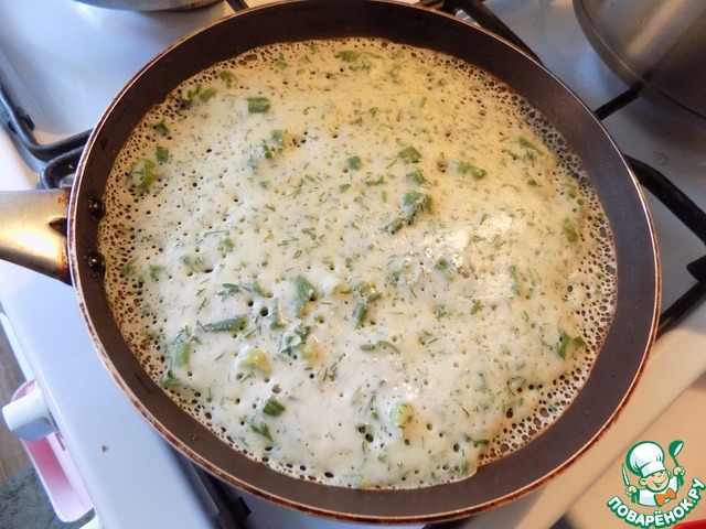 Соединила тесто с зеленью. Тесто не густое, чтобы хорошо растекалось по сковороде. Мы будем выпекать тонкие блины. Готово тесто к выпечке.