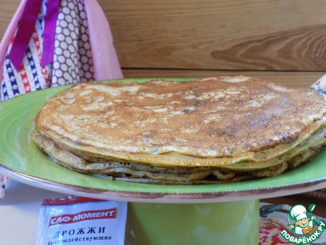 Из этого количества теста получилось 8 шт тонких и больших по диаметру блинов-24 см.